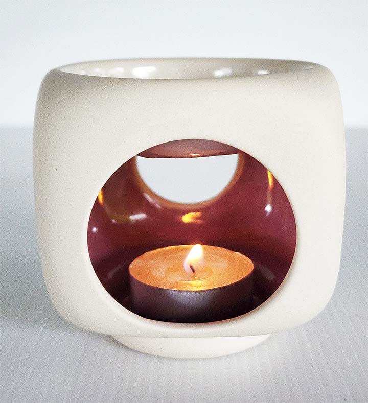 Fill the receptacle of the oil burner with water and then add a few drops of Siam Botanicals essential oils into the water. Place a lit T-light candle under the water receptacle to diffuse the essential oil.
